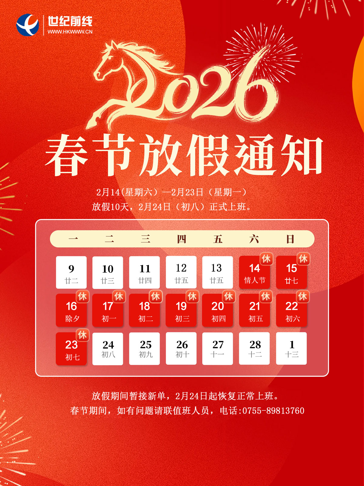 世纪前线2026年春节放假10天:2月14日~2月23日。2月23日(初八)上班。放假期间暂接新单,2.24日起恢复起正常上班。春节期间,如有问题请联系值班人员,电话:0755-89813760。给您带来的不便,敬请谅解!感谢您一直以来对世纪前线的支持与信赖,值此新春之际,向您致以新年的问候和诚挚的祝福。