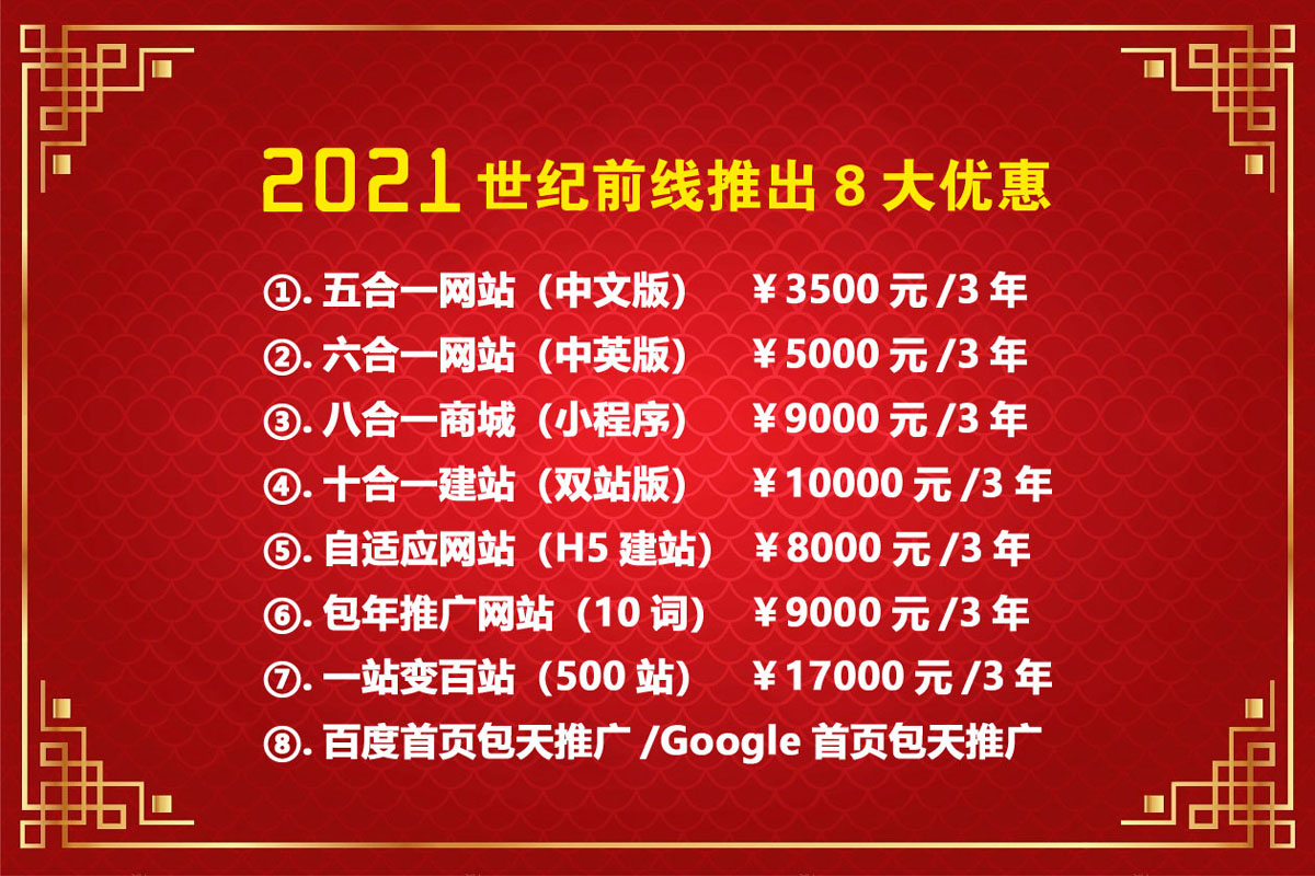 世纪前线2021年推出8大优惠:五合一网站、八合一网站、十合一网站、包年推广网站、关键词包天推广、一站变百站500站等。